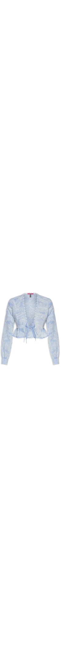 A blusa azul é confeccionada em tecido leve. A peça possui decote V com tiras finas aplicadas para amarração, mangas longas com abotoamento nos punhos, aplicação de bordados de folhagens em cor contrastante abstrata em cor contrastante, recorte na altura da barra, aplicação de renda no decote na barra, shape solto, comprimento cropped* e fechamento frontal por amarração.