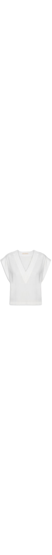 A blusa off white é confeccionada em tecido leve com toque de linho sem elasticidade. A peça solta ao corpo possui decote V, ombros e cavas estendidas, recortes nervuras, fendas laterais, transparência e sem forro.