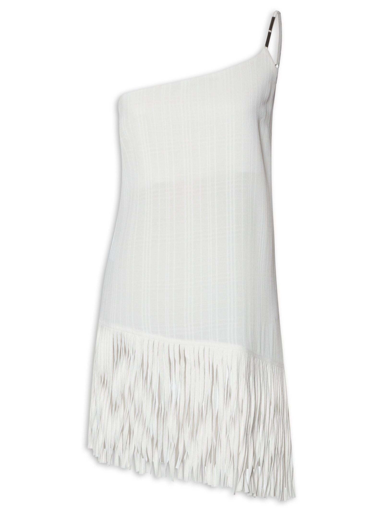 A blusa off white é confeccionada em crepe com toque de seda sem elasticidade. A peça solta ao corpo possui decote ombro único, alça fina com regulagem e aplicação metálica na parte frontal, meio forro, pences frontais na altura do busto, leve padronagem xadrez com superfície texturizada, comprimento alongado e barra assimétrica com franjas.
