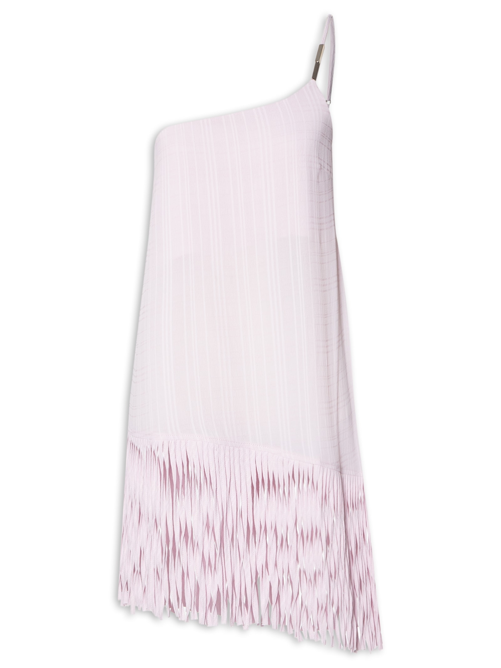 A blusa rosa é confeccionada em crepe com toque de seda sem elasticidade. A peça solta ao corpo possui decote ombro único, alça fina com regulagem e aplicação metálica na parte frontal, meio forro, pences frontais na altura do busto, leve padronagem xadrez com superfície texturizada, comprimento alongado e barra assimétrica com franjas.