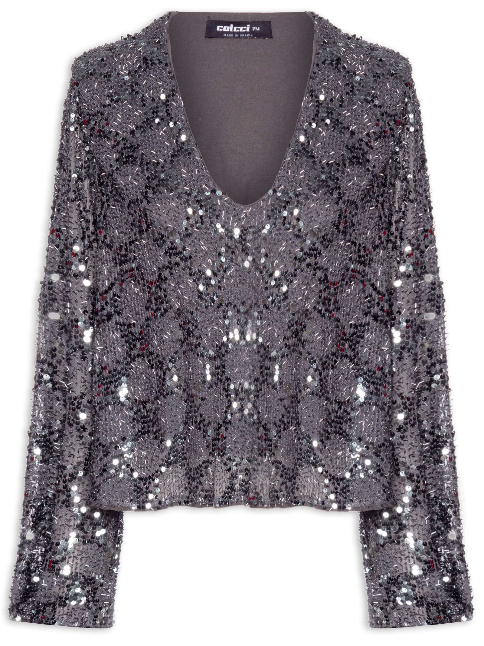 A blusa cinza é confeccionada em tecido leve com superfície em paetês e canutilhos sem elasticidade. A peça solta ao corpo possui decote V, mangas longas, transparência e forro.