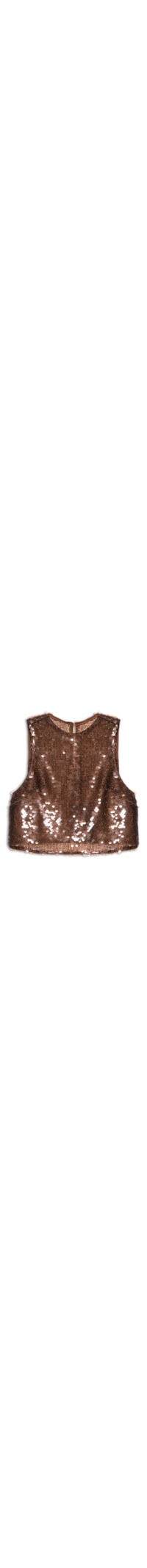 A blusa marrom é confeccionada em tecido leve com superfície em paetês e sem elasticidade. A peça solta ao corpo possui decote redondo, alças largas, pences na altura do busto, comprimento cropped* e fechamento posterior em botão aplicado em recorte vazado.