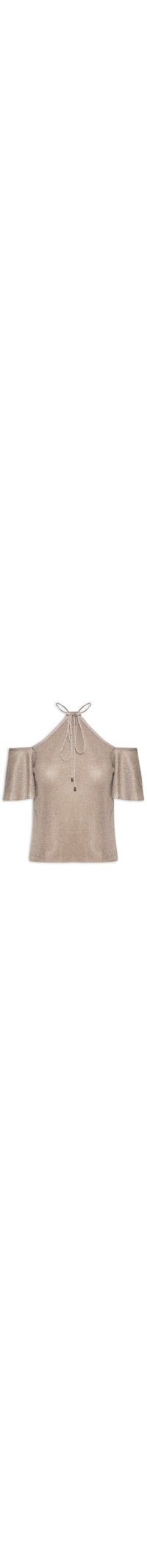 A blusa bege é confeccionada em tricot com fios de lurex e alta elasticidade. A peça solta ao corpo possui decote halter, mangas curtas, alças em tiras finas embutidas na parte posterior e com ponteiras metálicas para amarração frontal, barra com corte e fio e transparência.