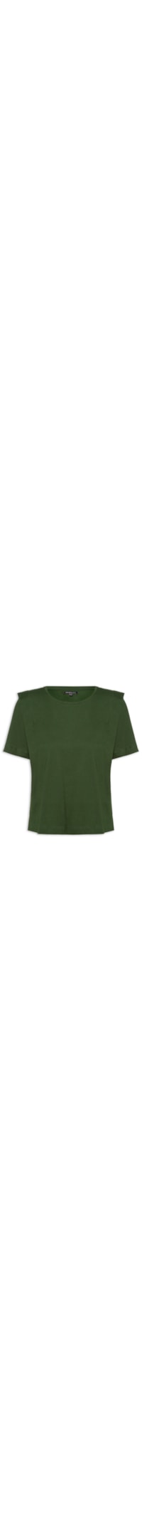 A blusa verde é confeccionada em malha de algodão de média elasticidade. A peça solta ao corpo, possui decote redondo com acabamento canelado, mangas curtas, recorte sobreposto nos ombros, fendas laterais, tag metalizada da marca aplicada na parte posterior do decote e barra mullet*.