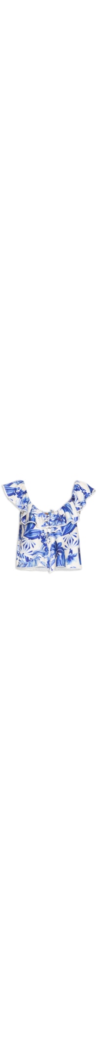 A blusa azul é confeccionada em tecido leve sem elasticidade. A peça solta ao corpo possui decote em V, alças finas com aplicação de babados com acabamento em renda fina, parte frontal com recortes e detalhes de amarração, estampa floral em tom de azul contrastante, comprimento cropped, barra arredondada com acabamento em renda fina, sem forro, sem fechamento.
