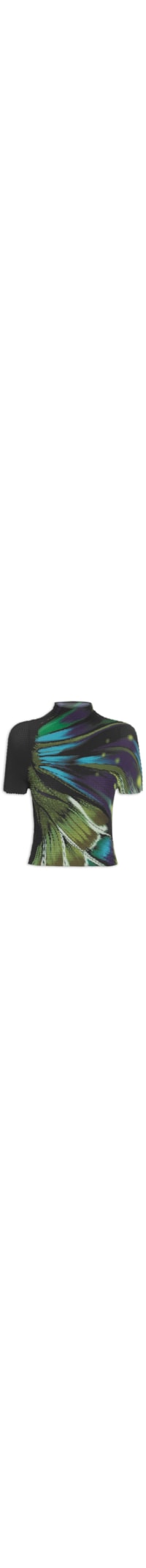 A blusa preta é confeccionada em tecido plano com tratamento plissado em relevo quadriculado e baixa elasticidade. A peça justa ao corpo apresenta decote gola olímpica com acabamento em bordas naturais do próprio tecido plissado, mangas curtas com acabamento em borda natural, estampa Pixel Butterfly em tons de verde, azul e roxo distribuída na frente e nas costas sobre base preta, modelagem cropped com caimento justo e barra com acabamento natural do tecido.