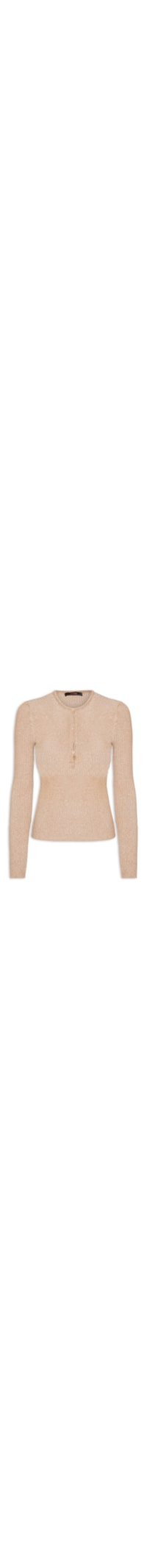 A blusa bege é confeccionada em tricot com baixa elasticidade. A peça solta ao corpo possui decote arredondado com abotoamento, mangas longas e acabamento texturizado.