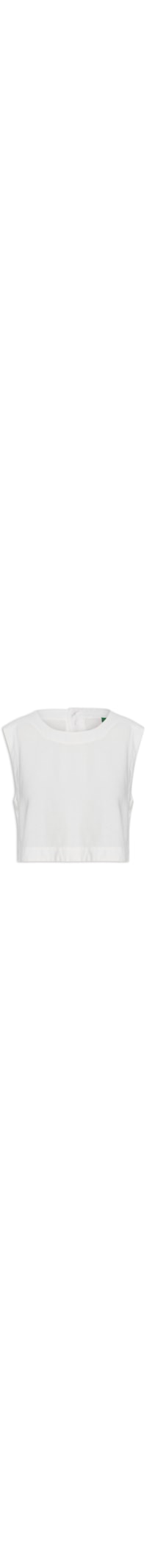 A blusa branca é confeccionada em tecido leve com toque de linho sem elasticidade. A peça solta ao corpo, possui decote redondo, alças largas, cavas estendidas, fenda posterior, leve transparência, comprimento cropped* e fechamento posterior por botões no decote.