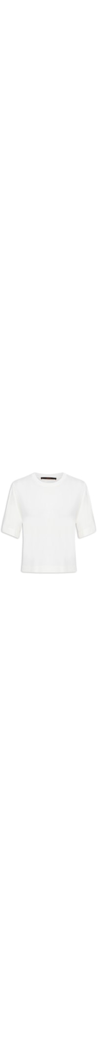 A blusa branca é confeccionada por tecido leve com baixa elasticidade. A peça solta ao corpo possui decote redondo com acabamento canelado e mangas curtas de modelo godê.