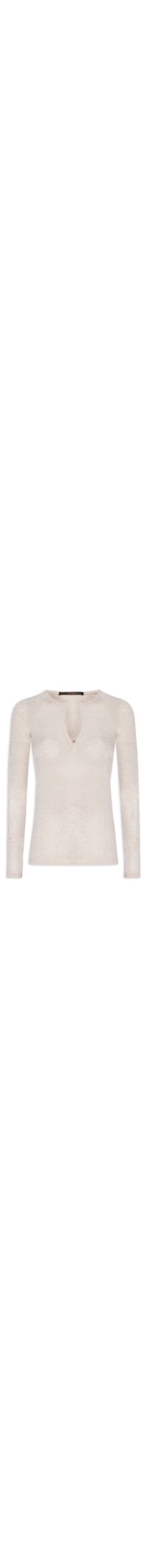 A blusa branca é confeccionado em tricot com alta elasticidade. A peça justa ao corpo possui decote V com fechamento por botão e mangas longas raglan.