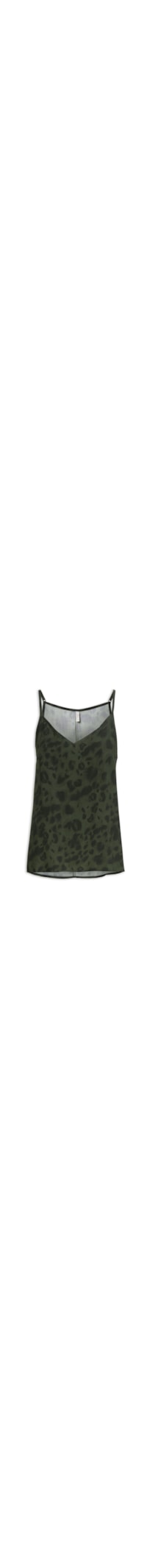 A blusa verde é confeccionada em rayon sem elasticidade. A peça solta ao corpo possui decote V, alças finas, cavas estendidas, recorte posterior e estampa em animal print.