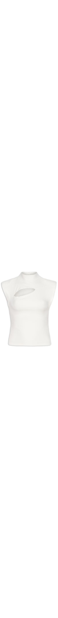 A blusa branca é confeccionada em malha com média elasticidade. A peça justa ao corpo possui gola alta, ombros e cavas estendidos, ombreiras embutidas, recorte frontal vazado e acabamento canelado.