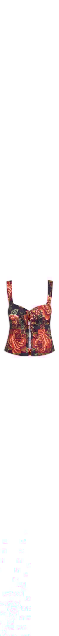 A blusa preta é confeccionada em linho misto sem elasticidade. A peça solta ao corpo possui decote coração, alças médias, recortes frontais com detalhe de pregas na altura do busto, mix de estampas em cores contrastantes e fechamento frontal em tiras alongadas para amarração.