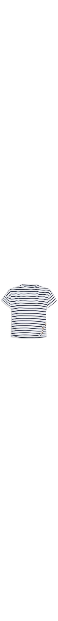 A blusa azul é confeccionada em malha leve de média elasticidade. A peça solta ao corpo, possui decote redondo, mangas curtas, recorte frontal com botões decorativos aplicados, tag metalizada da marca aplicada na parte posterior do decote e padronagem listrada branca e azul.
