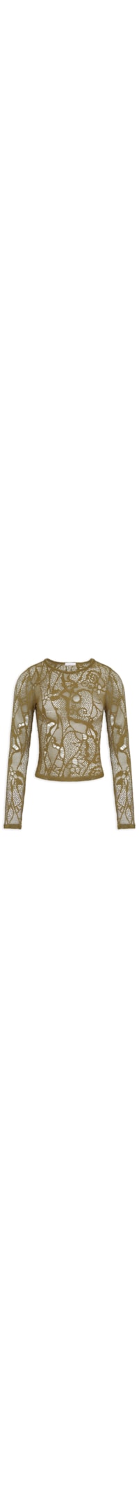 A blusa verde é confeccionada em renda com alta elasticidade. A peça justa ao corpo possui decote redondo, mangas longas e transparência.