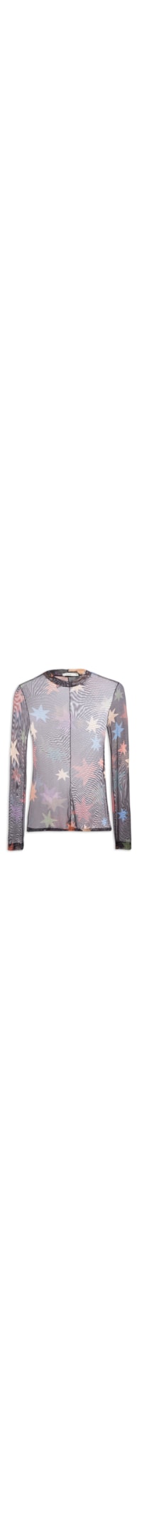 a blusa Preta é Confeccionada Em tule De Alta Elasticidade. A Peça Justa Ao Corpo, Possui Gola Alta, Mangas Longas, Estampa Figurativa De Estrelas Em Cores Contrastantes E Transparência.
