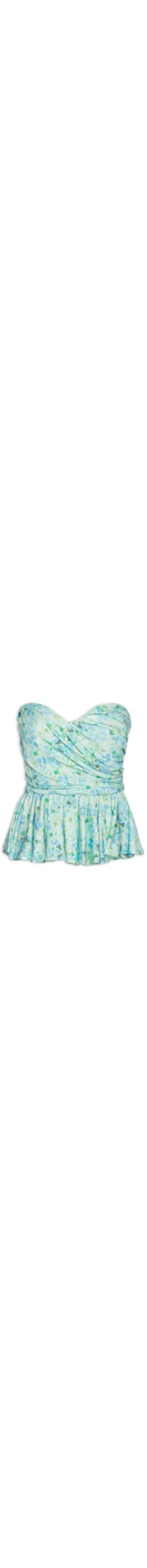 A blusa azul é confeccionada em tecido leve com baixa elasticidade. A peça de modelo tomara que caia justa na altura do busto e da cintura e solta no comprimento possui decote coração com pregas e detalhe de drapeado, sem bojo, recorte na altura da cintura com babado, estampa floral em cores contrastantes e fechamento posterior por zíper invisível.