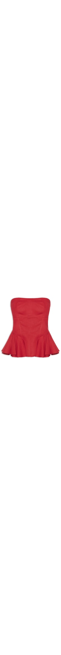 A blusa vermelha é confeccionada em linho misto sem elasticidade. A peça justa ao corpo de modelo tomara que caia possui decote reto, recortes na parte frontal, recorte posterior em lastex e recortes na parte frontal e posterior com pregas e efeito de babado.