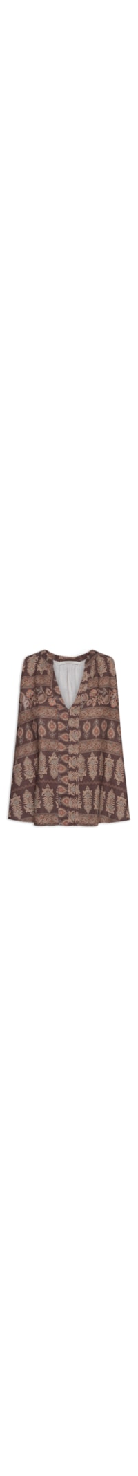 A blusa marrom é confeccionada em tecido leve com toque de linho sem elasticidade. A peça solta ao corpo possui decote V, alças médias, cavas estendidas, mix de estampas em cores contrastantes e recortes frontais.