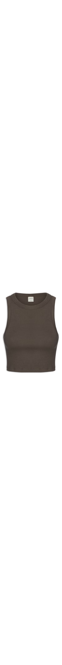 A blusa marrom é confeccionada em tecido leve. A peça possui decote redondo, alças médias, cavas regulares, comprimento cropped* e acabamento canelado.
