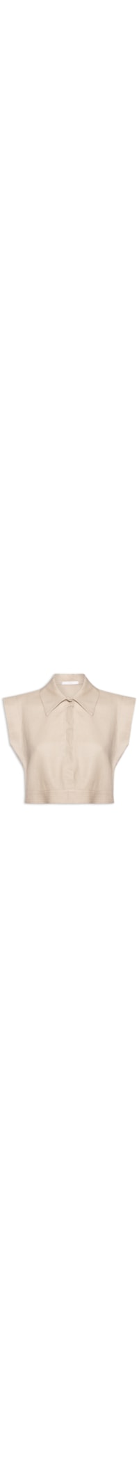A blusa bege é confeccionada em linho misto sem elasticidade. A peça solta ao corpo possui colarinho clássico, cavas regulares, ombros estendidos, tag da marca aplicada em metal na parte posterior, comprimento cropped* e fechamento frontal por botões com vista sobreposta.