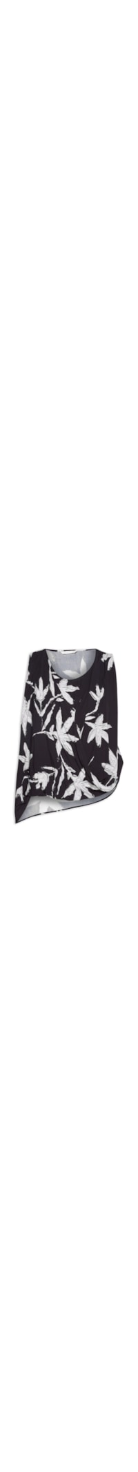 A blusa preta é confeccionada em tecido leve sem elasticidade. A peça solta ao corpo possui decote arredondado, alças finas, cavas regulares, tecido sobreposto a parte frontal com efeito drapeado e padronagem floral na cor branco.