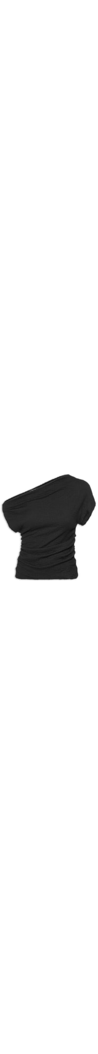 A blusa preta é confeccionada em malha com superfície texturizada e alta elasticidade. A peça solta ao corpo possui decote assimétrico, mangas curtas e elástico embutido nas partes laterais com franzidos.