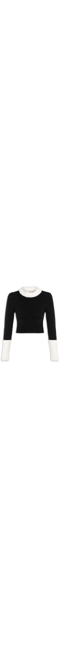 A blusa preta é confeccionada em tricot. A peça possui gola alta, mangas longas, recorte em cor contrastante e com aplicação de fleece na altura da gola e dos punhos, comprimento cropped*, shape justo, caimento reto e acabamento canelado.