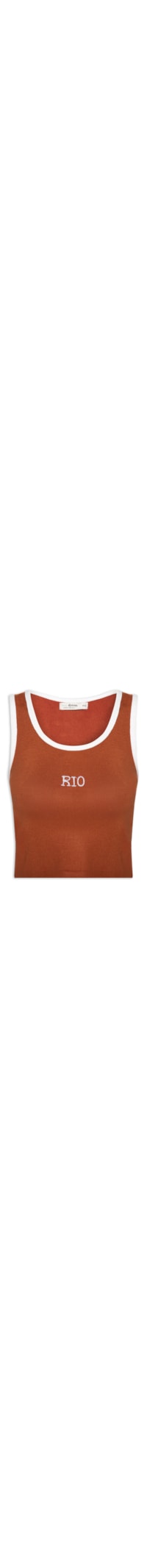 A blusa marrom é confeccionada em tricot de média elasticidade. A peça justa ao corpo possui decote U, alças médias, aplicação frontal de bordado escrito na cor branca, acabamento em viés de cor branca e comprimento cropped*.