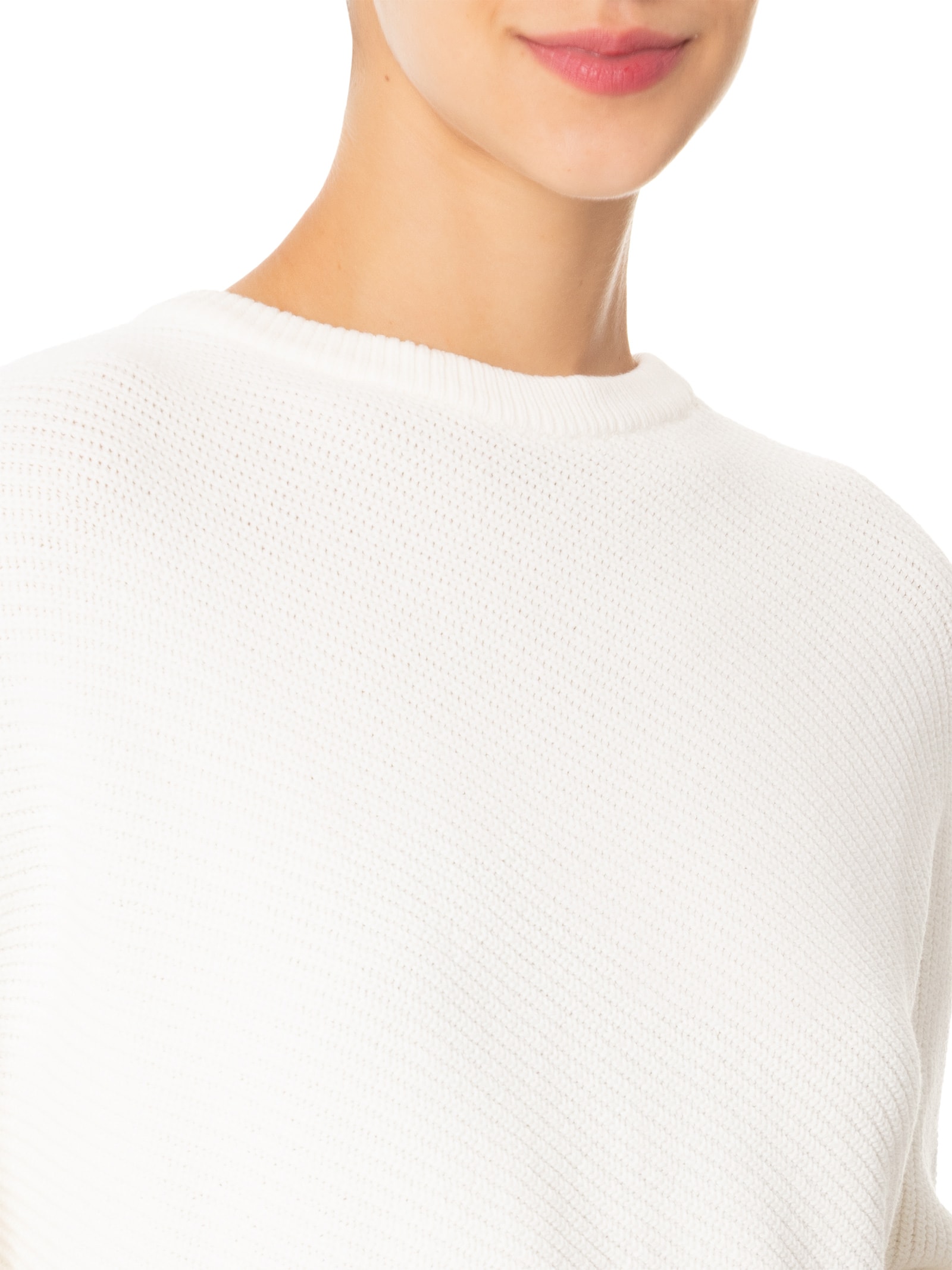 A blusa branca é confeccionada em tricot com superfície canelada e alta elasticidade. A peça solta ao corpo possui decote canoa, ombros estendidos, mangas longas com ajuste nos punhos e tag da marca aplicada em metal na parte frontal da barra.