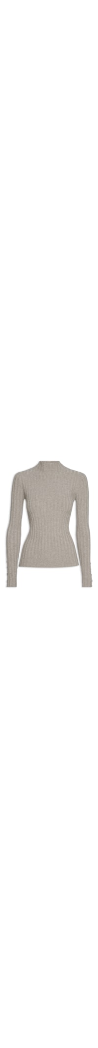 A blusa cinza é confeccionada por tricot canelado com alta elasticidade. A peça justa ao corpo possui gola alta e mangas longas.