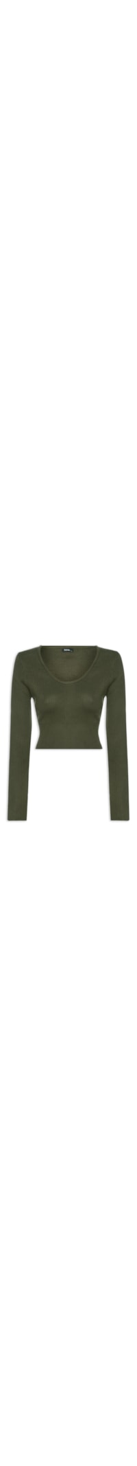 A blusa verde é confeccionada em tricot canelado com alta elasticidade. A peça solta ao corpo possui decote redondo, mangas longas e comprimento cropped*.