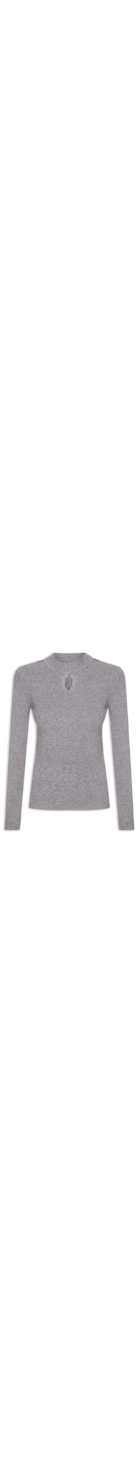 A blusa cinza é confeccionada em tricot com superfície canelada com alta elasticidade. A peça justa ao corpo possui gola alta, mangas longas e recorte frontal com aplicação de strass na altura do busto.