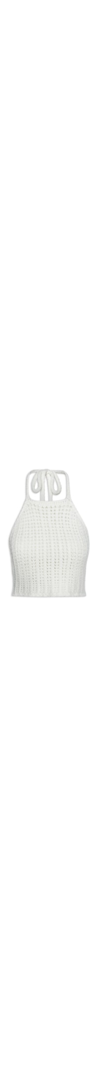 A blusa branca é confeccionada por tricot com média elasticidade. A peça justa ao corpo de modelo frente única possui decote halter, alças finas, leve transparência, forro e comprimento cropped*.