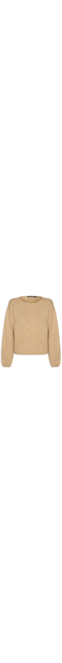 A blusa bege é confeccionada em tricot com baixa elasticidade. A peça possui gola canoa, mangas longas com leve volume, ombros levemente deslocados, modelagem ampla, comprimento cropped* e acabamento canelado nos punhos e barra.