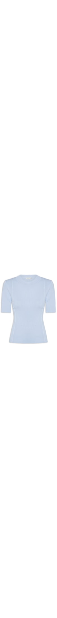 A blusa azul é confeccionada por tricot com superfície canelada e alta elasticidade. A peça solta ao corpo possui decote redondo, mangas curtas, recortes na parte frontal e superfície texturizada.