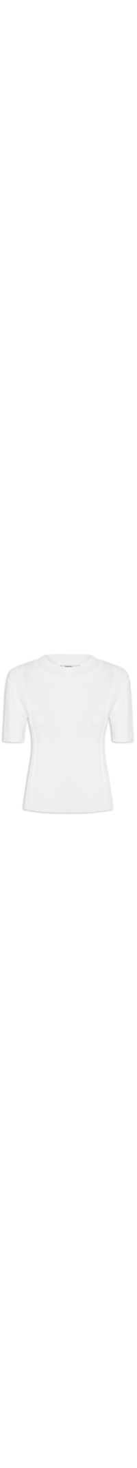 A blusa branca é confeccionada por tricot com superfície canelada e alta elasticidade. A peça solta ao corpo possui decote redondo, mangas curtas, recortes na parte frontal e superfície texturizada.
