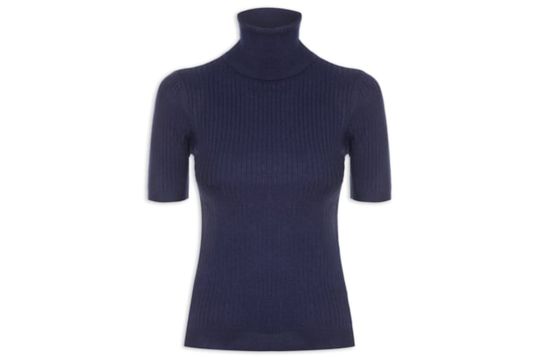 A blusa azul marinho é confeccionada em tricot com alta elasticidade. A peça justa ao corpo possui gola alta e mangas longas com ajuste nos punhos.