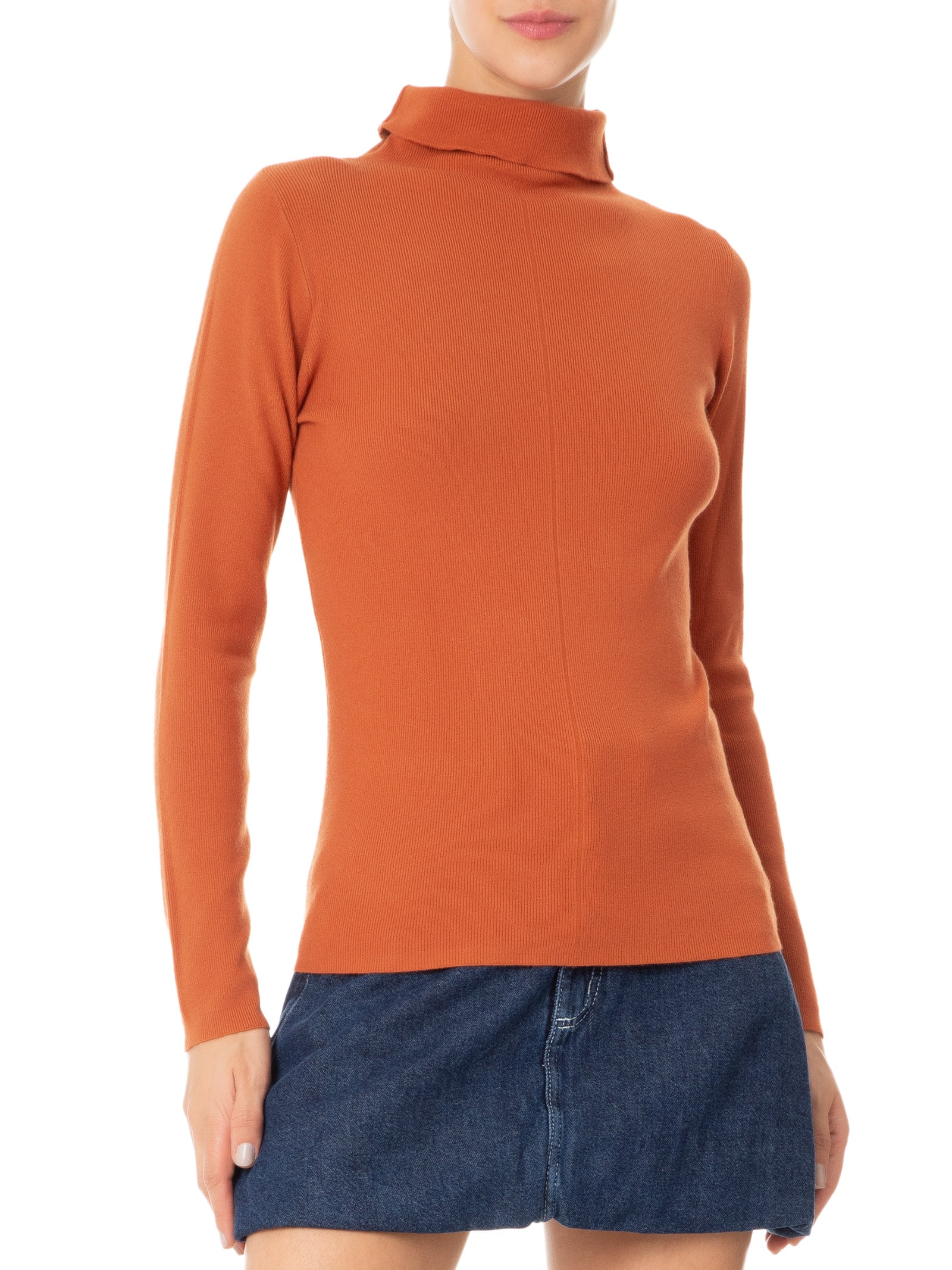 A blusa laranja é confeccionada em tricot com alta elasticidade. A peça justa ao corpo possui gola alta e mangas longas com ajuste nos punhos.
