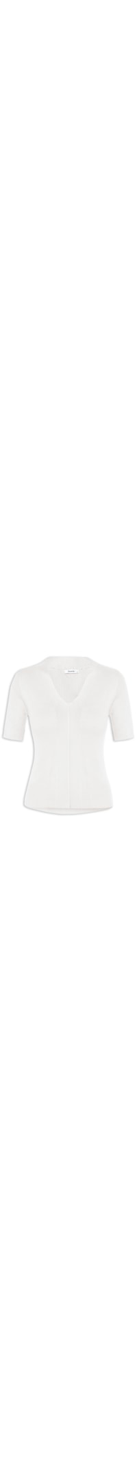 A blusa off white é confeccionada em tricot com superfície canelada e alta elasticidade. A peça justa ao corpo possui decote V, mangas curta e recortes com detalhe em relevo.