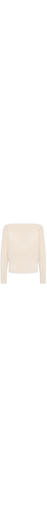 A blusa bege é confeccionada em tricot com superfície canelada e alta elasticidade. A peça solta ao corpo possui decote canoa e mangas japonesas longas.