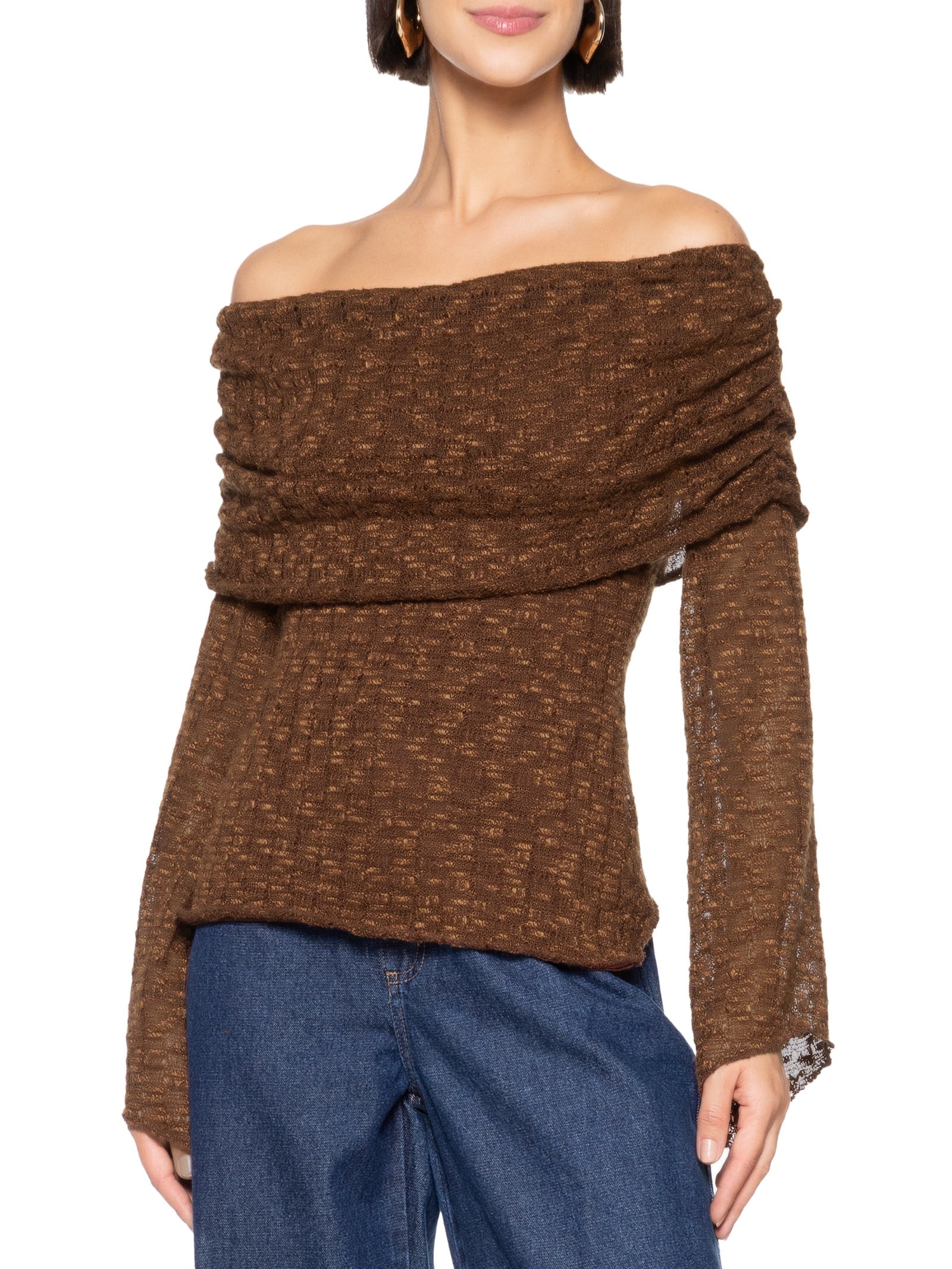 A blusa marrom é confeccionada em tricot com média elasticidade. A peça solta ao corpo possui decote reto, mangas longas, tecido sobreposto na área do busto, transparência, forro e tag da marca aplicada na parte posterior.