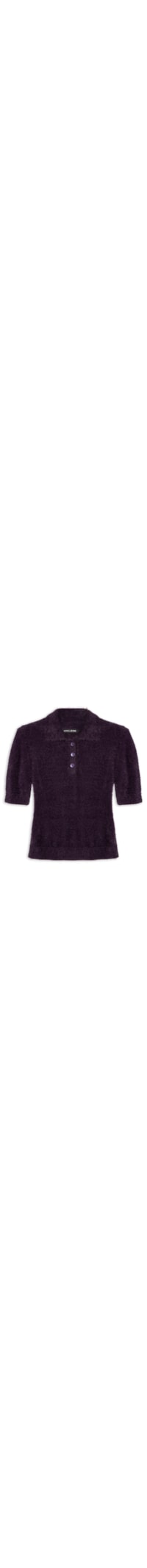 A blusa roxa é confeccionada em tricot com superfície em pelúcia e média elasticidade. A peça solta ao corpo possui gola esporte, mangas curtas, tag metálica da marca aplicada na parte posterior, acabamento canelado e fechamento frontal em botões.