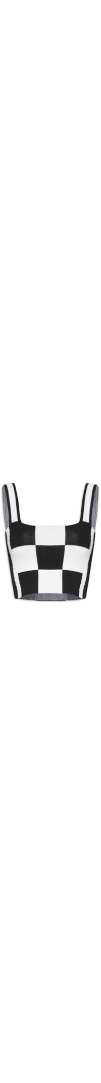 A blusa preta é confeccionada em tricot com média elasticidade. A peça justa ao corpo possui decote frontal e posterior reto, alças finas, cavas regulares, padronagem quadriculada em cor contrastante e comprimento cropped*.
