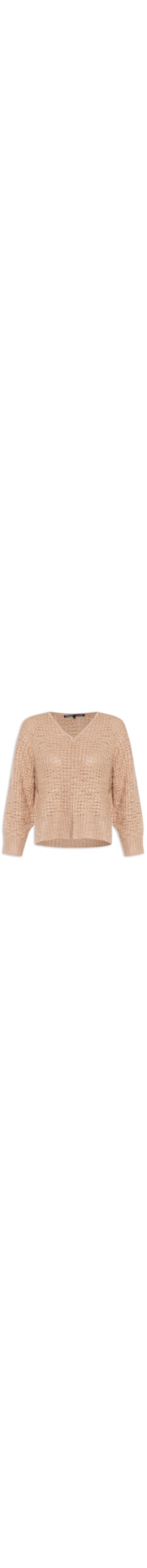 A blusa bege é confeccionada em tricot tramado em diferentes pontos. A peça possui decote V, mangas longas, barra mullet, fendas laterais, shape solto, caimento reto e acabamento canelado.