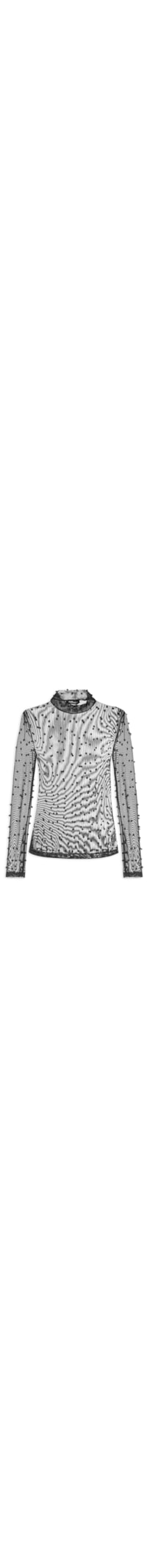 A blusa preta é confeccionada em tule com alta elasticidade. A peça justa ao corpo possui decote redondo, mangas longas, aplicação de aviamentos, transparência e tag da marca aplicada no decote posterior.