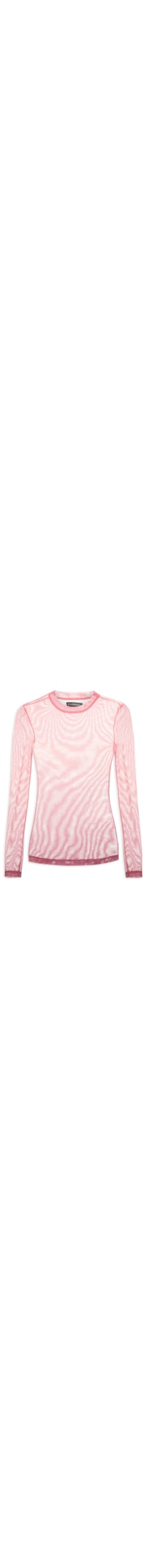 A blusa preta é confeccionada em tule com alta elasticidade. A peça justa ao corpo possui decote arredondado, mangas longas, efeito degradê e transparência.