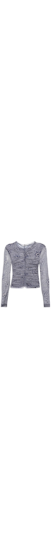 A blusa azul é confeccionado é confeccionado por tule com média elasticidade. A peça justa ao corpo possui decote redondo, mangas longas, detalhes franzidos, estampas figurativas em cor contrastante, forro e leve transparência.