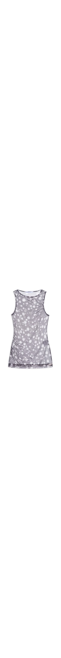 A blusa preta é confeccionada em tule com alta elasticidade. A peça justa ao corpo possui decote redondo, alças médias, cavas regulares, transparência, detalhe franzido com efeito drapeado nas laterais e padronagem de poá na cor branco.