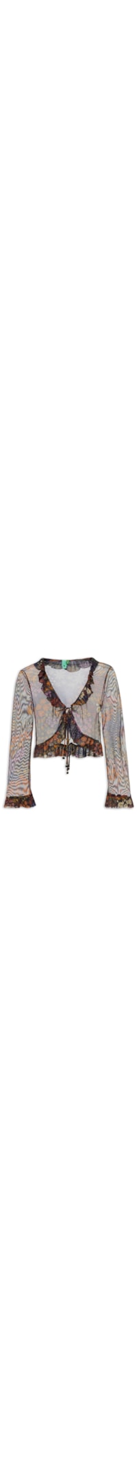 A blusa preta é confeccionada em tule de média elasticidade. A peça solta ao corpo, possui decote em V, mangas longas, babado aplicado nos punhos, gola e barra, estampa floral em cores contrastantes, transparência, comprimento cropped* e fechamento frontal por cordão com ponteira de miçanga para amarração.
